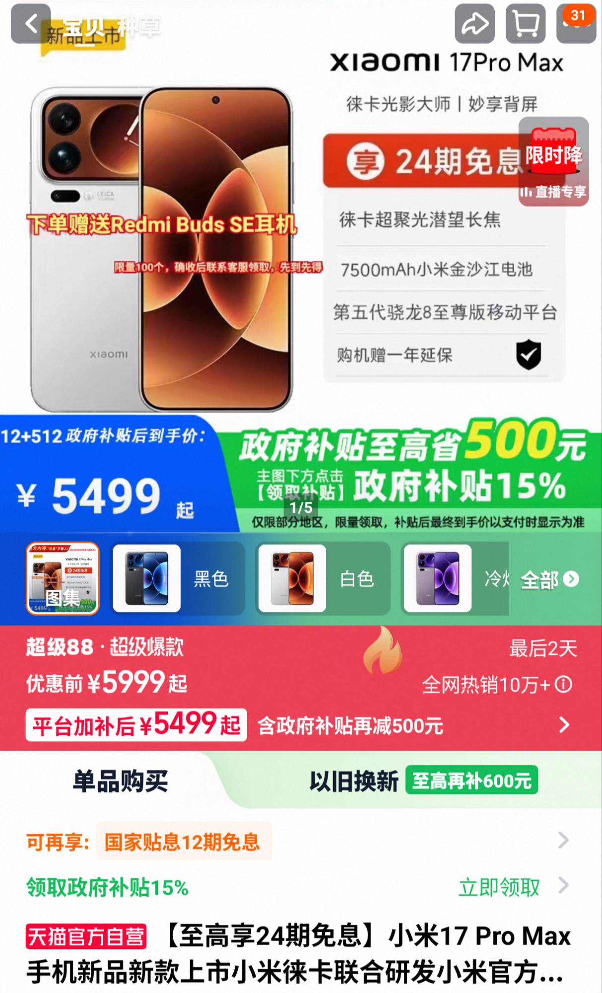 【囯补后5499】小米17 Pro Max 12+512GB ,