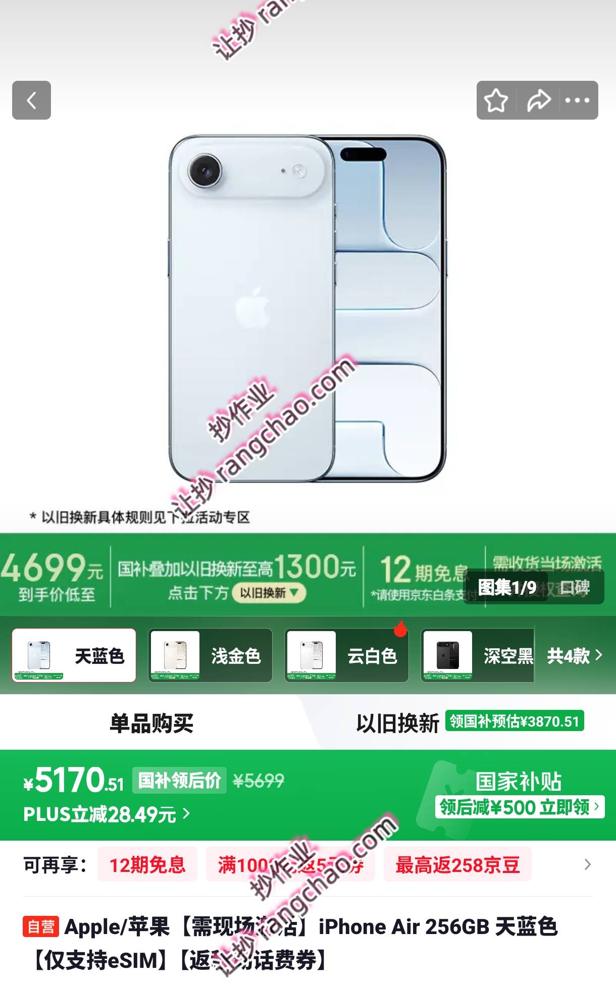 iPhone Air 256GB【5170】限湖北江苏山西河北江西等地区国补