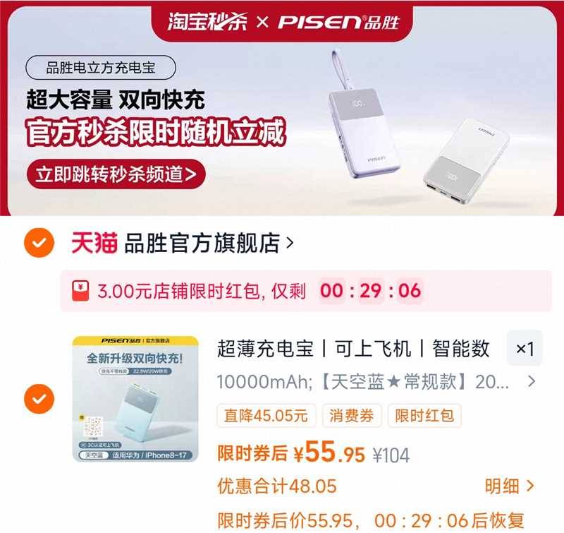 下拉拍,限时55.9~58元‼ 品胜大容量充电宝1W毫安 6(Kw0sUz5Arh0)/ CA1371 https://m.tb.cn/h.igDxsoO 部分弹3元店铺荭包! ❗(复制到淘宝打开)