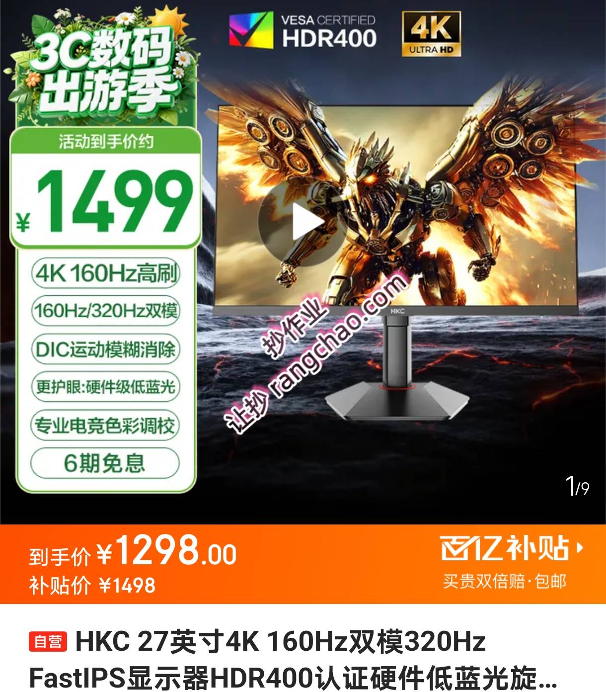 HKC 27英寸4K 160Hz双模320Hz FastIPS,1299
