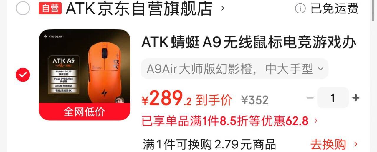 ATK蜻蜓A9 Air 大师版 幻影橙【289】,瑞幸 意式黑咖浓缩咖啡液 18ml*32颗【52】折1.6/颗