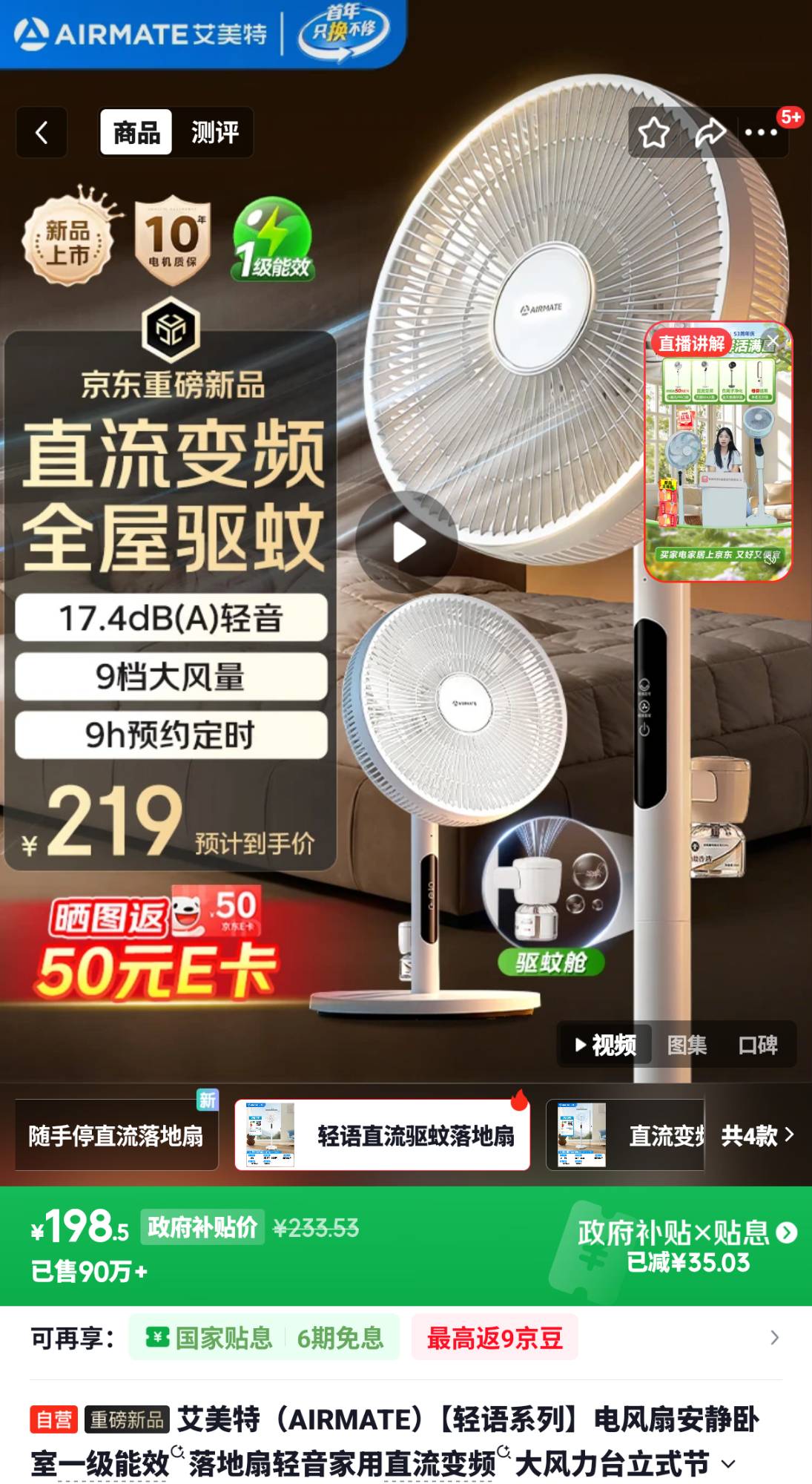 自营艾美特 遥控全屋驱蚊循环扇 叠政府补贴到手198.5元 好评返50E卡;实际到手149.5