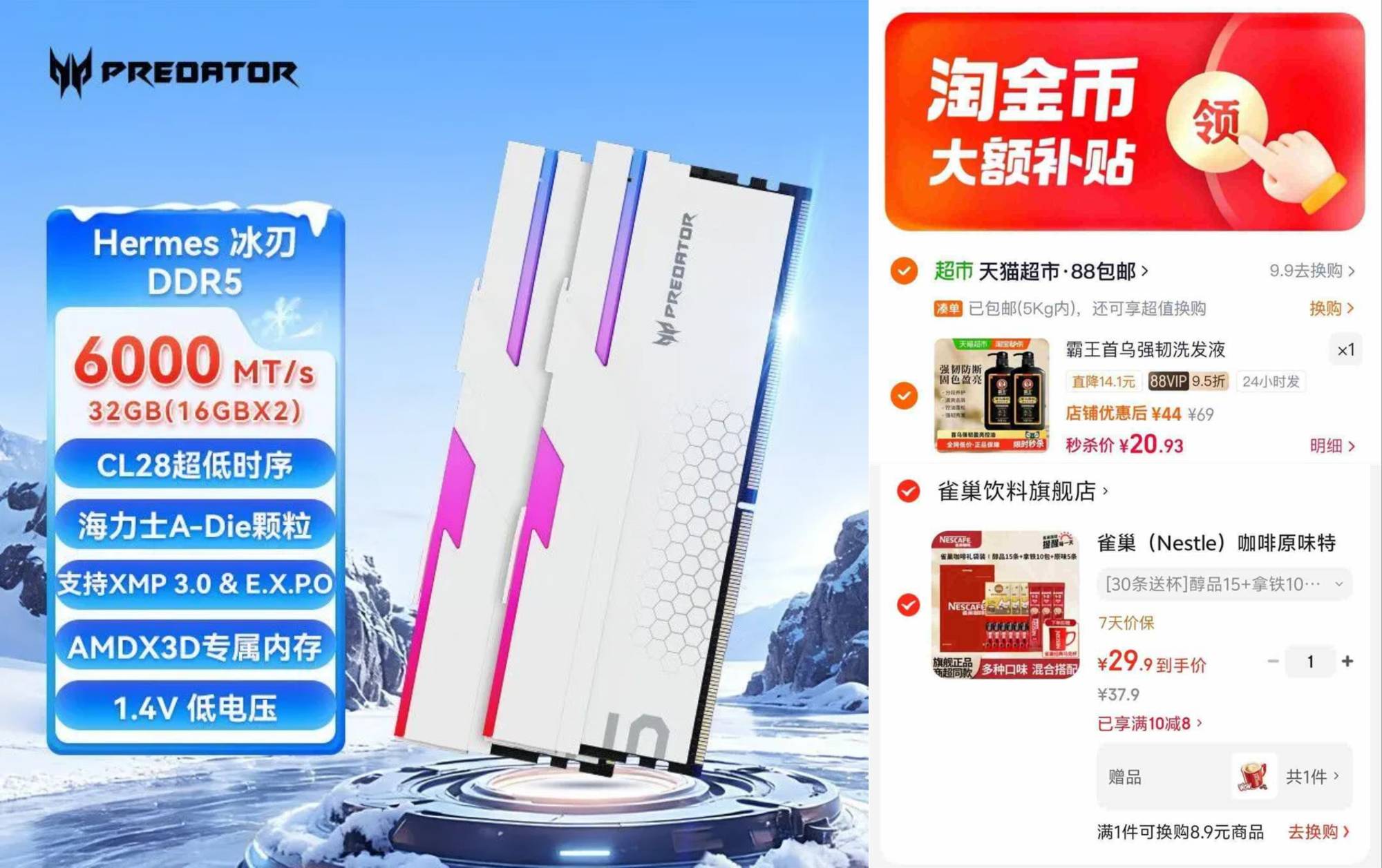 【2589】宏碁 冰刃32G(16G×2) DDR5 6000 C28台式机内存条RGB灯条 https://p.pinduoduo.com/jjs3678x?sc=EFAC 用V3荟員奍-200