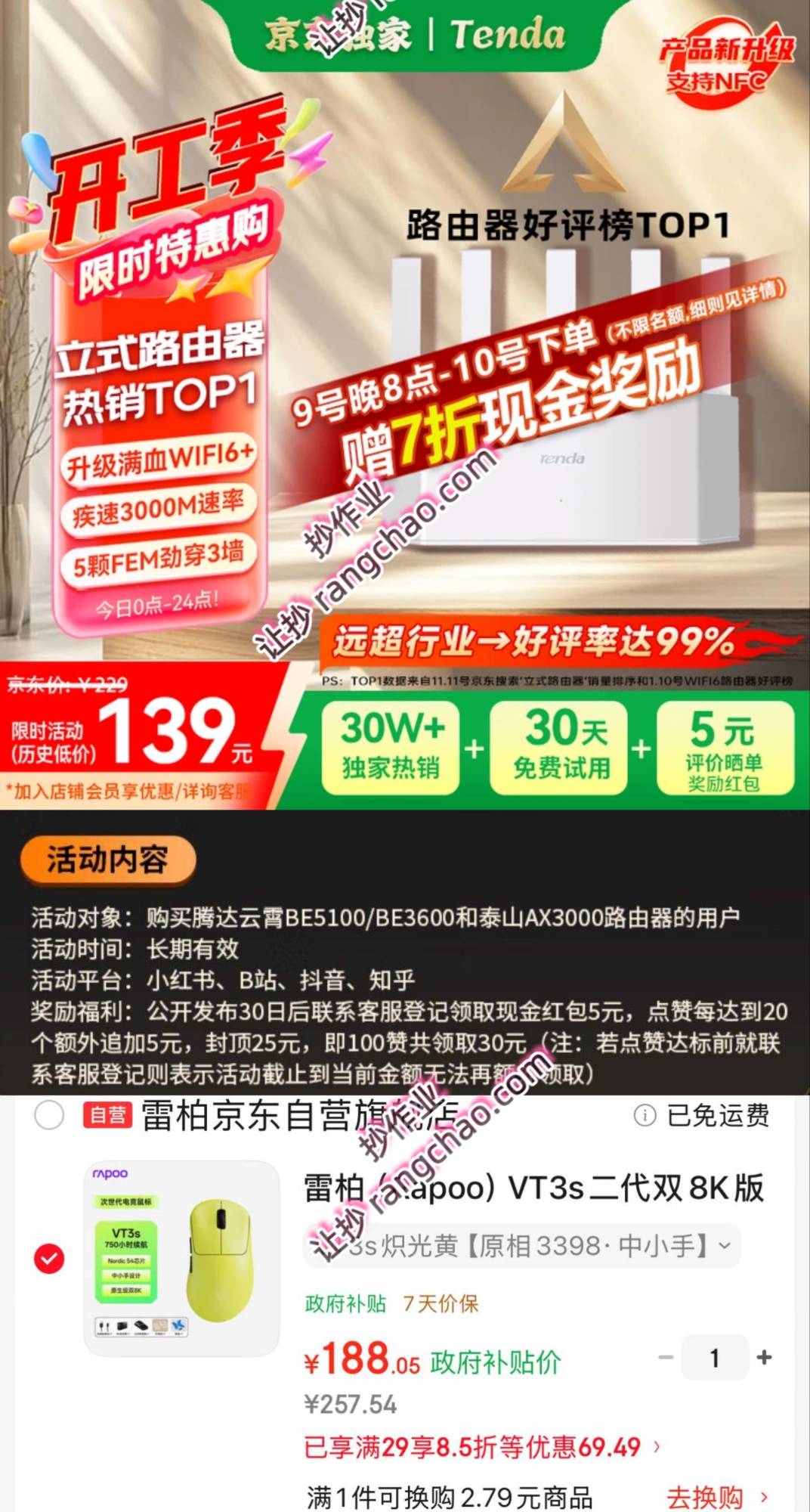 【188】雷柏VT3s二代双8K版 中小手无线/有线双模游戏鼠标 轻量化设计原相3398引擎 原生8K+8K回报率 黄色