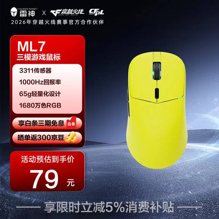 【75】雷神ML7 高阶三模鼠标PAW3311人体工学无孔设计 柠黄