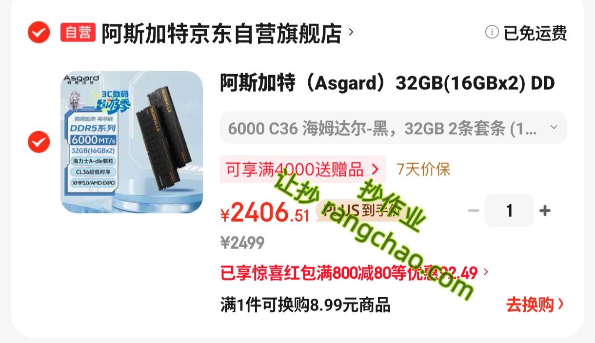 自营 【2436】阿斯加特6000 c36海力士A-die 16GB x 2 内存条