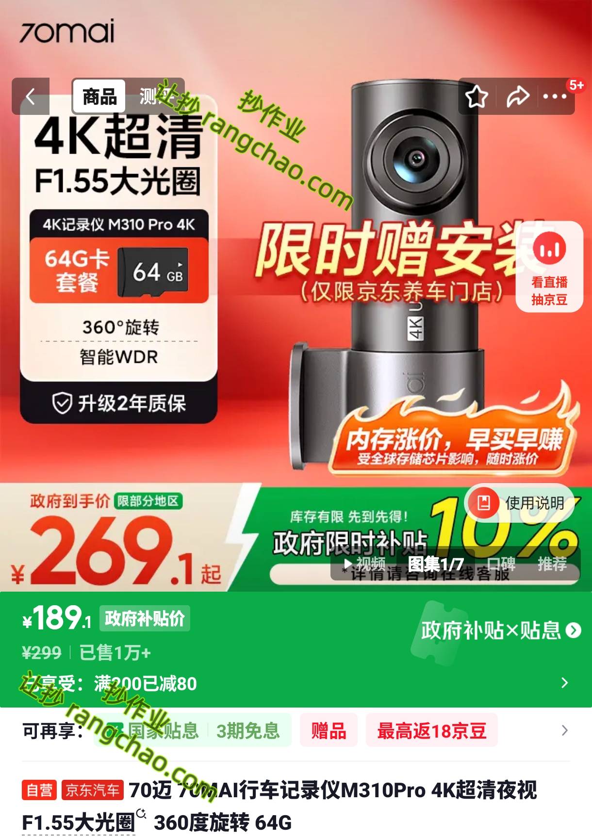 70迈 M310Pro4K 超清 行车记录仪 64G,补贴到手189