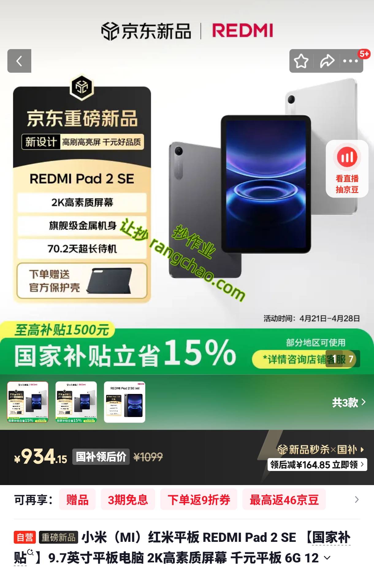 今日,REDMI 正式宣布 REDMI Pad 2 SE 开启发售,该机推出 6GB+128GB 版本,定价 1099 元,叠加国家补贴后到手价低至 934.15 元,成为小米当前在售机型中价格最低的平板。据小米商城信息显示,该机另有 4GB 版本,目前暂未开售。