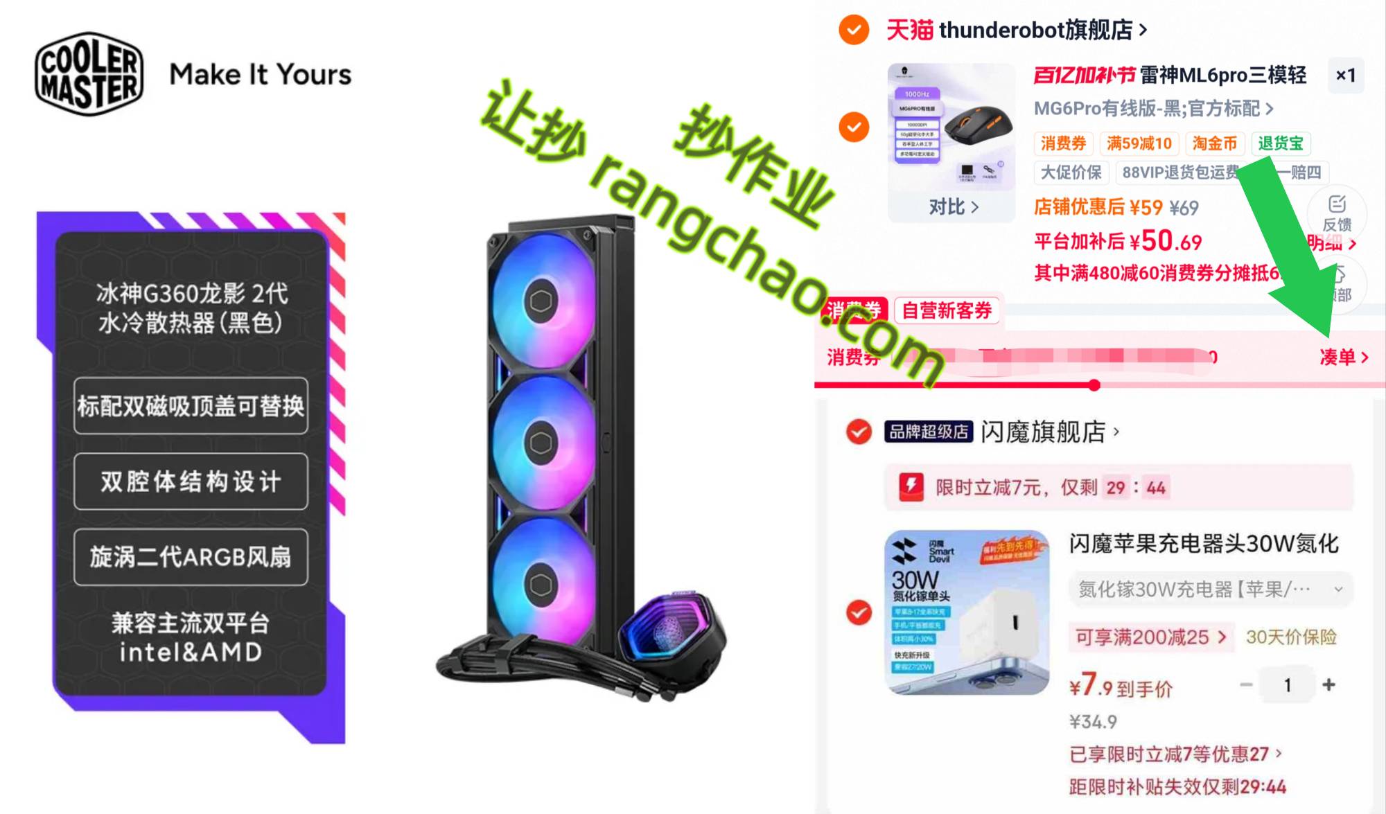 【439】酷冷G360龙影2代 基础版ARGB水冷。雷神MG6Pro有线游戏鼠标59。闪魔 氮化镓30W快充单头7.9~14.9