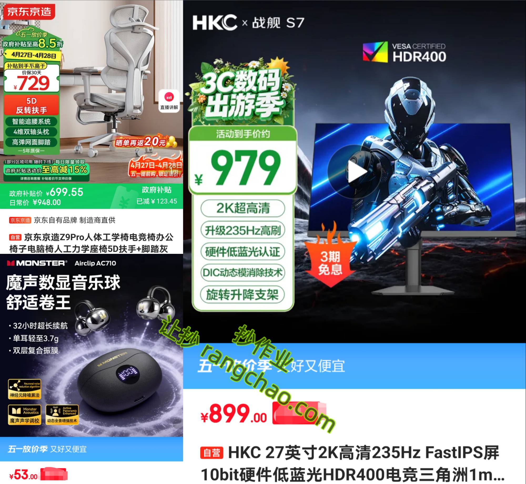 京造Z9Pro人体工学椅【679】晒反20。HKC 27英寸2K高清235Hz FastIPS屏10bit硬件低蓝光,899。魔声Airclip AC710 蓝牙耳机耳夹式,50,找客服返3