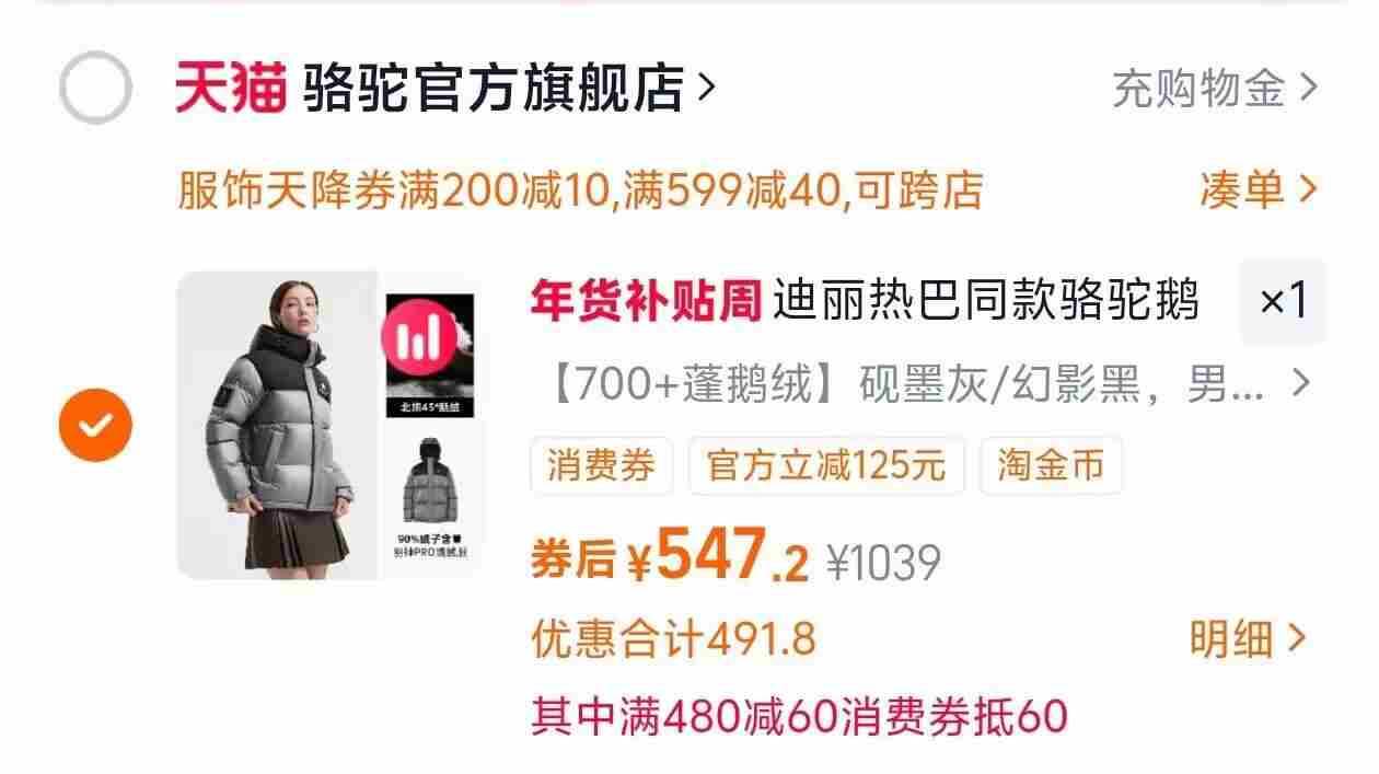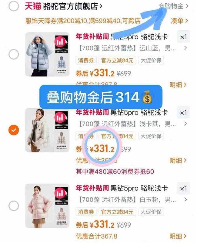 骆驼羽神pro鹅绒服双倍礼.菳💰547左右 ⚠️右上甪三个点(…)菧扣24桃凎芘和弹出156荭包 消費巻➕掏金幣💰533-542