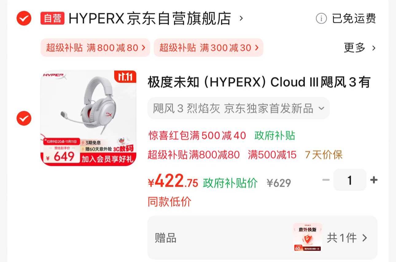 ①拎500减40,耳机加伡1
