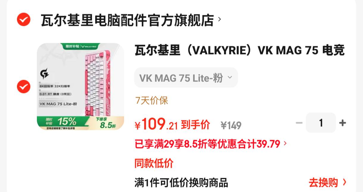 瓦尔基里 VK 75 Lite粉磁轴键盘【109.21】